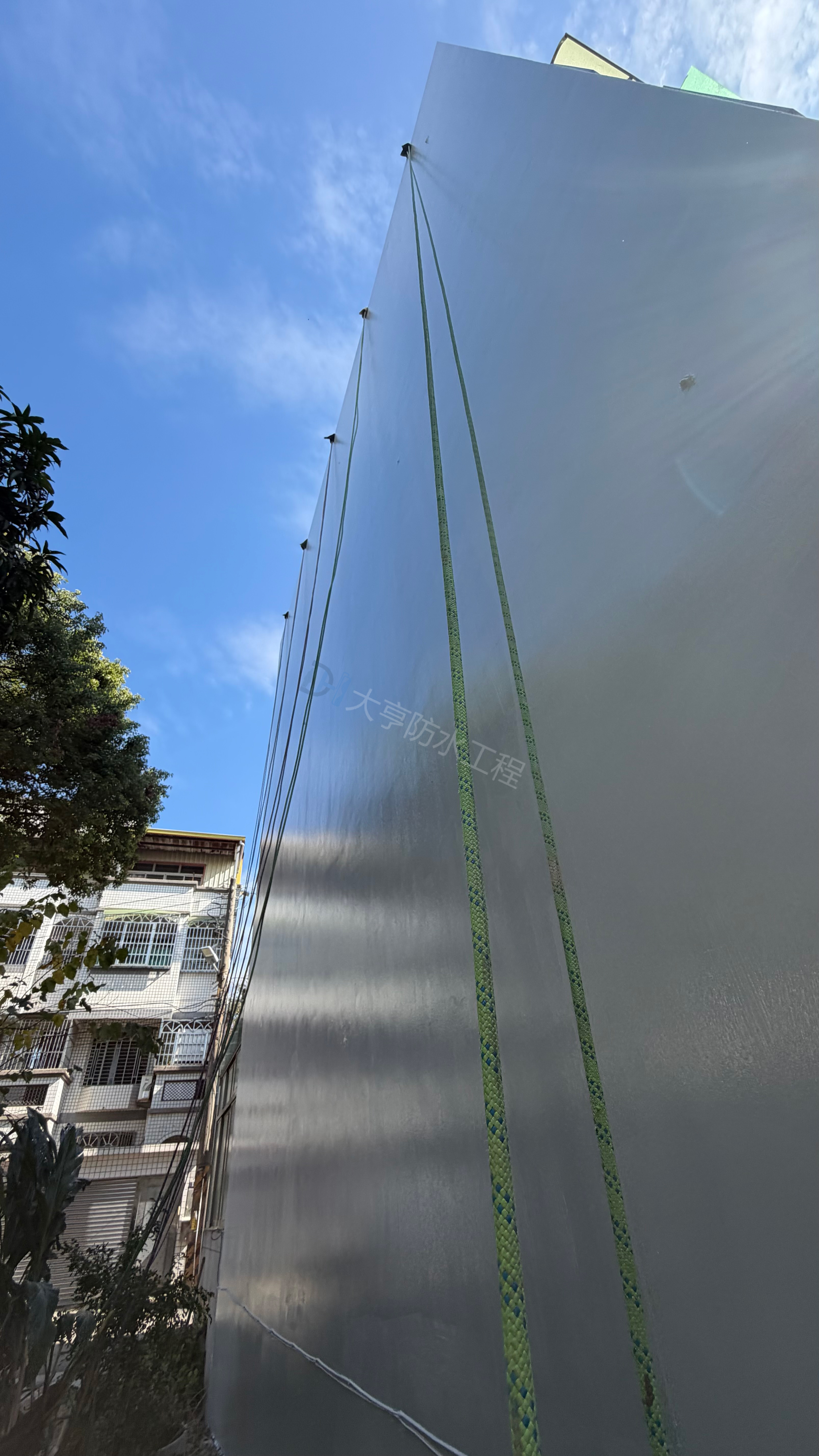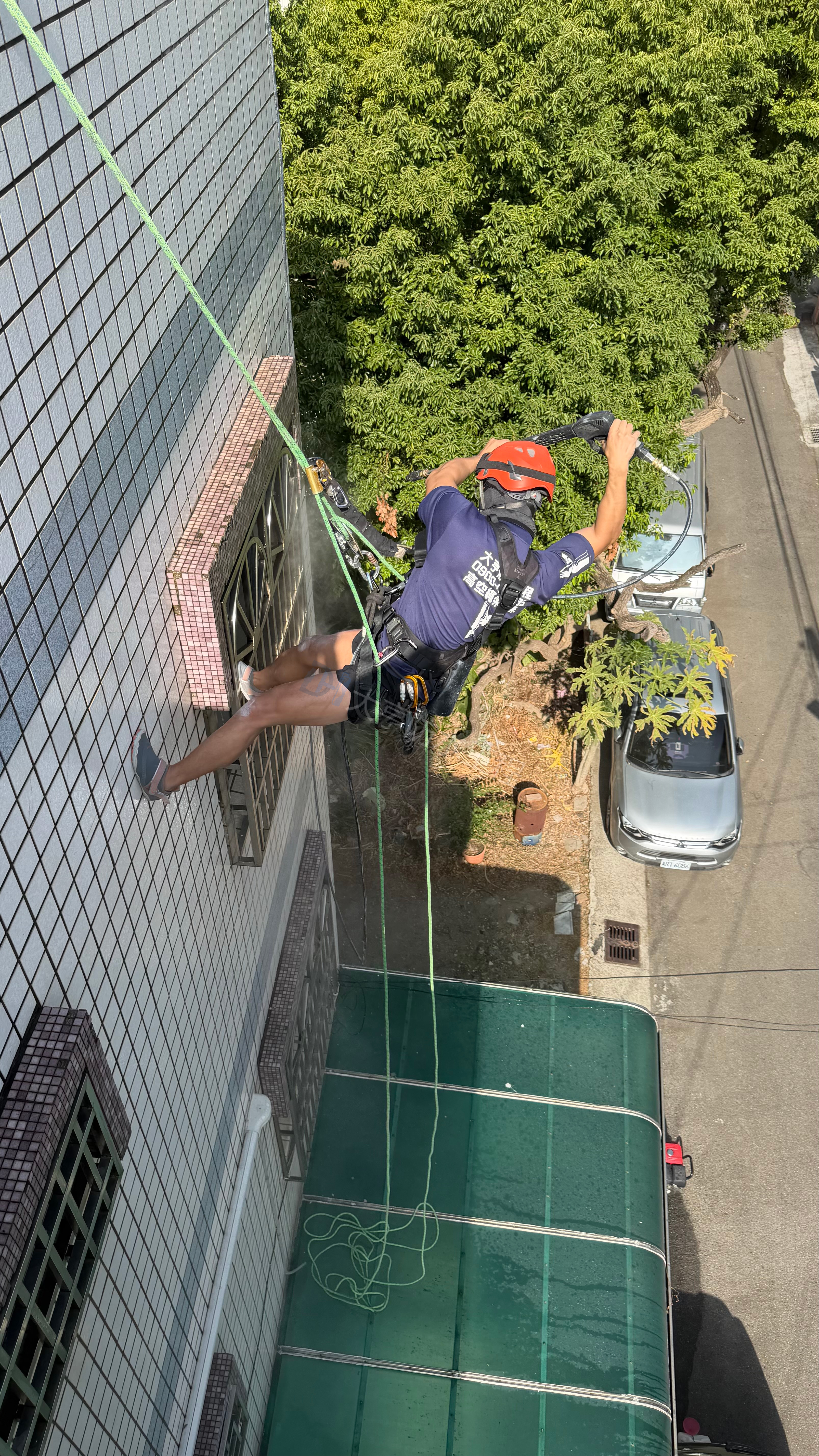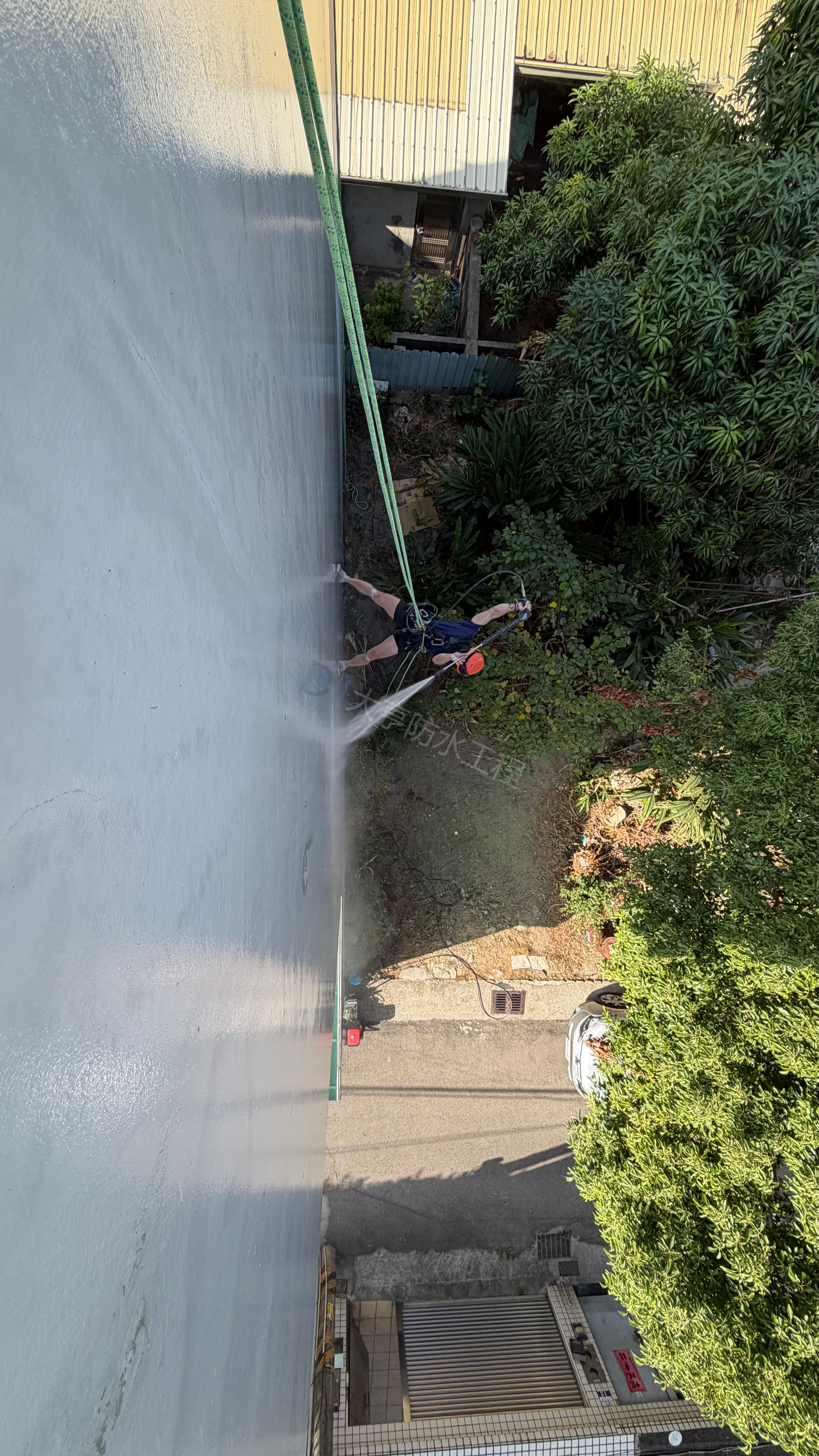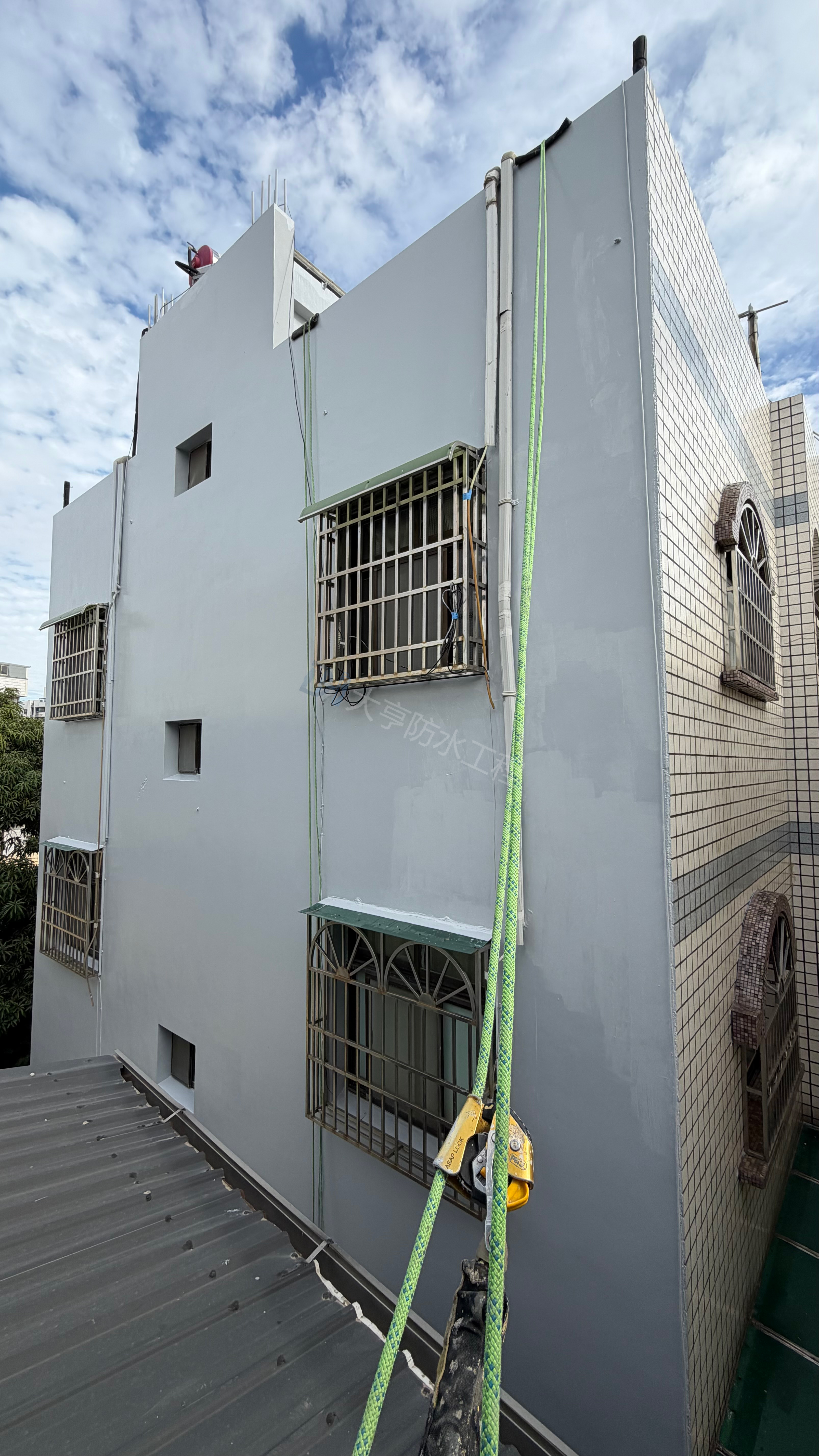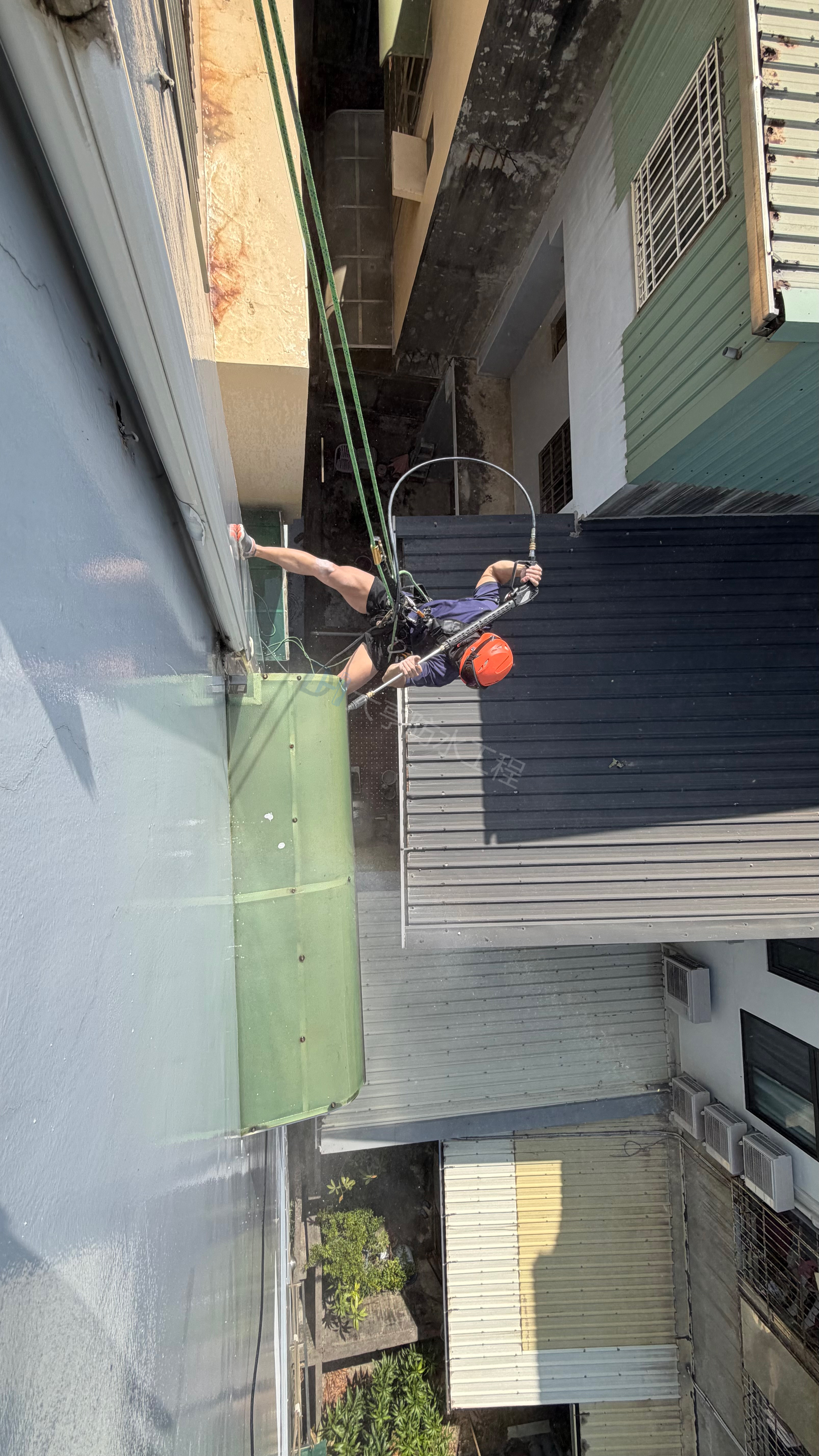 針對外牆老化與壁癌漏水,採用「高空繩索(蜘蛛人)工法」,免搭鷹架、工期短且干擾小。嚴格執行高壓清洗、裂縫補強至彈性防水層施作,徹底修復窗框與磁磚縫隙,為建築提供安全可靠的長效防水保護。